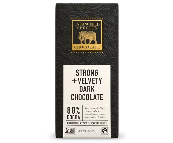 Description Feel good about indulging your sweet tooth with Endangered Species Natural Dark Chocolate. With every bite, you'll enjoy the rich, delectable taste of natural dark chocolate with 88% cocoa - and it's both vegan and gluten-free. The best part is that 10% of all net profits are donated to help support the world's many endangered species.Contains: SoyMay Contain: Tree nuts, peanuts, MilkStore: In a Dry location at Room temperatureDietary Needs: Gluten free, Fair Trade Certified, Kosher, Vegan, Non-GMO Project VerifiedForm: PiecesState of Readiness: Ready to eatPackage Quantity: 1Chocolate type 1: Dark chocolatePackage type: Individual item multi-servingCandy color: BrownNet weight: 3.0 ouncesExterior container material: Paper or cardboardNatural dark chocolate bar with 88% cocoaGluten-free and vegan chocolate10% of net profits donated to helping support endangered species Estimated shipping dimensions: 0.35INCH X 2.75INCH X 5.75INCH DPCI : 055-02-1007 UPC : 037014242478 TCIN : 17099532 Estimated shippimg weight: 0.188POUND