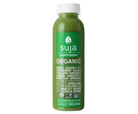 Description Made with the mightiest of greens like collards and kale, this vibrant and nutrient dense drink can make your body sing. Mighty dozen contains apple, celery, cucumber, kale, collard greens, lemon, peppermint tea, spearmint tea, spinach, ginger, spirulina, chlorella, barley grass and alfalfa grass. Suja Mighty Dozen is USDA certified Organic, Non-GMO Project Verified, Cold-Pressured, Kosher, Dairy-free, Soy-free, Gluten-Free and contains no added sweeteners.Contains: Does not contain any of the 8 major allergensMay Contain: Does not contain any of the 8 major allergensStore: In a Perishable location at RefrigeratedFeatures: Cold pressed, soy free, no added sugar, dairy free, non-GMODietary Needs: Gluten free, Certified Gluten Free, Non-GMO Project Verified, Organic certified, VeganForm: LiquidState of Readiness: Ready to drinkPercentage juice content 1: 97Package type: Individual item single servingExterior container material: PlasticNet weight: 12.0 ouncesPackage Quantity: 0Beverage container material: PlasticSuja Organic Mighty DozenOrganic, Cold-Pressed, Non-GMO, HPPGluten Free, Dairy Free, Vegan,12 oz.Full of organic cold-pressed fruits and vegetables and super greens like chlorella and spirulina for maximum nutrient density Estimated shipping dimensions: 2.185INCH X 7.395INCH X 2.185INCH DPCI : 211-08-0496 UPC : 854208005080 TCIN : 16978093 Estimated shippimg weight: 0.75POUND