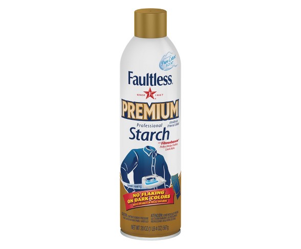 Description Keep your clothing crisp and pristine with Faultless Premium Spray Starch - 20 oz. This professional grade spray starch is simply applied to your garment before ironing to create clean crease, smooth textures and a fully polished look that lasts.Scent: UnscentedHealth Facts: Aluminum-free, Bleach-free, dye-free, paraben-freeProduct Warning: Combustible, contents under pressure, do not puncture or incinerate, do not reuse empty container, flammableCapacity (Volume): 20 ouncesFormulation: Color Safe, No RinseProduct Form: AerosolRecommended Surface Application: Clothing, Fabric, Polyester, CottonSurfaces Not Recommended: LeatherProfessional spray starch for ironingHelps make clothes look like newNo flaking on dark colorsPure Cotton scent Estimated shipping dimensions: 11.0INCH X 9.7INCH X 6.7INCH DPCI : 003-07-0365 UPC : 017500209420 TCIN : 12880539 Estimated shippimg weight: 1.485POUND