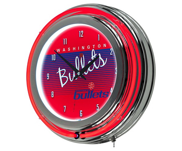 Description Every game room, garage or man cave could use the addition of an officially licensed neon clock. So why not add one of the highest grade clocks on the market to your collection This impressive clock has not just one but two neon rings. It has an accent colored neon ring on the exterior and a brilliant white neon ring on the interior of the clock to light up your favorite logo. Other highlights include chrome finished resin housing and a high grade glass clock face cover. The battery operated quartz clock mechanism will keep your new prize precise and ticking for a long time, while the neon runs off the included AC adapter. The neon is controlled by the pull chain and the back of the clock includes a wall hanging mount. The 3 inch depth of this clock combined with the radiant shimmer of the neon reflecting off the chrome housing is sure to make this clock pop off of any wall. Bring style and function to your game room,garage or collection with an officially licensed double ringed neon clock. Features include:High Grade Glass CoverHigh Polished Chrome Finish Molded Resin HousingOfficially Licensed Full Color Logo on the Clock DialDouble Ringed Neon (Outside Ring Coordinates with Printed Logo and Inside Ring Illuminates the Clock Face)Battery Operated Quartz Clock MechanismRequires 1 AA Battery for Clock Operation (Not Included)AC Power Adapter with 6 ft. CordWall Hanging MountDimensions: 3 x 14.5 x 14.5 inchesFeatures: Round (shape)Dimensions (Overall): 14.5 inches (H) x 14.5 inches (W) x 3.0 inches (D)Weight: 5.3 poundsIndoor/Outdoor: IndoorMetal Finish: ChromeAssembly Details: No assembly requiredClock Face Color: MulticoloredDisplay Type: AnalogFrame Color: RedMaterial: MetalPower Source: Battery-poweredWarranty: 30 day limited warranty. To obtain a copy of the manufacturer's or supplier's warranty for this item prior to purchasing the item, please call Target Guest Services at 1-800-591-3869 Estimated shipping dimensions: 20.5INCH X 5.5INCH X 16.5INCH DPCI : 047-83-0189 UPC : 886511611108 TCIN : 17185698 Estimated shippimg weight: 6.0POUND