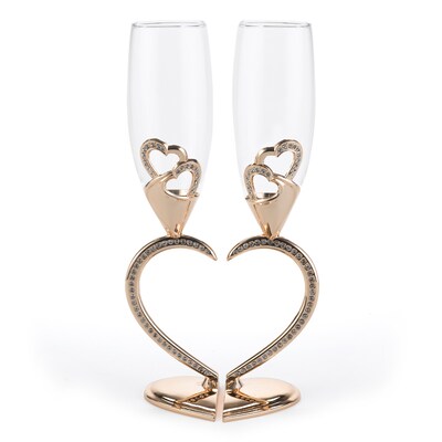 Description Hortense B. Hewitt Sparkling Hearts Linked Flutes - Cheers with decorative flutes Newly married couples will love these Sparkling Hearts Linked flutes featuring gold plated stems to enjoy with each other at the ceremony when toasting to their future. What a great keepsake after the big day! When you put the flutes together, the stems create a heart. These glass flutes are engraved. The glass flutes are not dishwasher safe. Each glass holds 6 ounces of liquid and is sold as a set of 2. The dimensions of each glass flute are 10'' tall. This Hortense B Hewitt Wedding Flutes will add a special touch to your wedding! Rose Gold Base Handwash Only 6 Ounces 10" Tall Specifications Brand : Hortense B Hewitt Customizable : No Weight : 0.84 lbs. per Pair