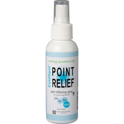 Description Water-based formula minimizes grease and residue Provides soothing menthol relief Made from all natural ingredients Applies easily and penetrates quickly Calming peppermint scent 4oz. spray bottle Specifications Allergy Free : Yes Fluid Type : Liquid Application Type : Spray Scented : Yes Purpose : Cooling Brand : Point Relief Customizable : No Weight : 1.00 lbs. per Each