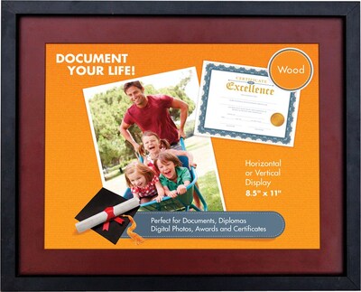 Description Wood Frame V-Light Tu-Tone Black and Mahogany Wood Frame, 8 1/2" x 11" Wood Frame, with glass face, and MDF back 8.5"x11" Tu-Tone Black with Mahogany Inner Frame, clear glass frame Easel-back for desktop display or be wall mounted with hangers that is included Display or hang vertically or horizontally 90 Days Limited Warranty Specifications Brand : Victory Light Customizable : No Weight : 2.10 lbs. per Each