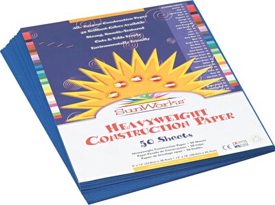 Description 12" x 9" - 50 / Pack - Dark Blue Brightly colored, all-purpose construction paper is made from a high-strength, smooth-textured heavyweight material. Long, strong fibers cut clean and fold evenly without cracking. Paper is made with a chemical-free pulping process to help ensure a cleaner environment. Construction paper is recyclable. Features long, strong fibers that cut clean and fold evenly without cracking 58 lbs. It is also made with a chemical-free pulping process to help ensure a cleaner environment Brightly colored, all-purpose construction paper High-strength, smooth-textured heavyweight material Specifications Color Family : Blue Pack Qty : 50 Sheet Dimension : 9x12" True Color : Dark Blue Height in Inches : 12+ Width in Inches : 9 Brand : SUNWORKS Customizable : No Weight : 0.72 lbs. per Pack