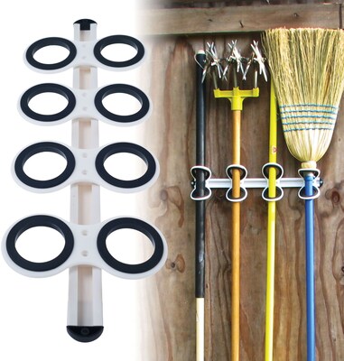 Description Saving you valuable storage space, Trademark Tools™ Universal Utility Tool Holder conveniently stores brooms, rakes, shovels and more on your wall. Trademark Tools™ Universal utility tool holder features a PVC plastic construction for durability. Tool holder measuring 3/4" x 16 1/2" x 5 5/8" helps you clean up the shed, garage, home or work area. 3/4" x 16 1/2" x 5 5/8" PVC Plastic Material Tidy up shed, garage, home or work area Holds up to 4 tools Space saving design Universal Utility Tool Holder Type Specifications Application/Usage : PVC Plastic Construction Height : 6 1/2" Width : 1 1/2" Depth : 1" Type : Tool Holder Brand : Trademark Tools Customizable : No Weight : 1.00 lbs. per Each