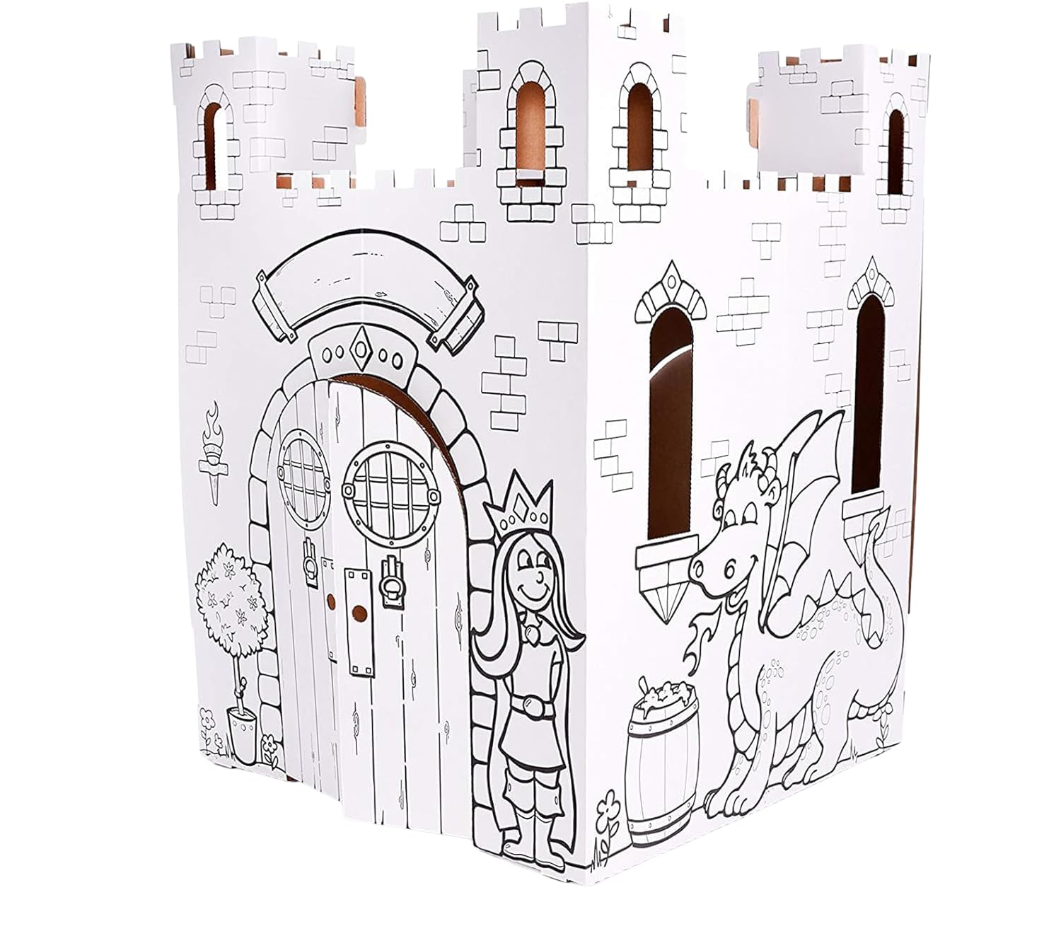 The Easy Playhouse Fairy Tale Castle is a large, lightweight cardboard playhouse designed for kids aged 3 and up. It features a reversible design with 8 windows, 4 turrets, fold-out doors, and interactive mail slots. This eco-friendly, USA-made castle assembles in under 5 minutes without tools and doubles as a customizable art canvas, encouraging imaginative role play and social interaction for up to 4 children.