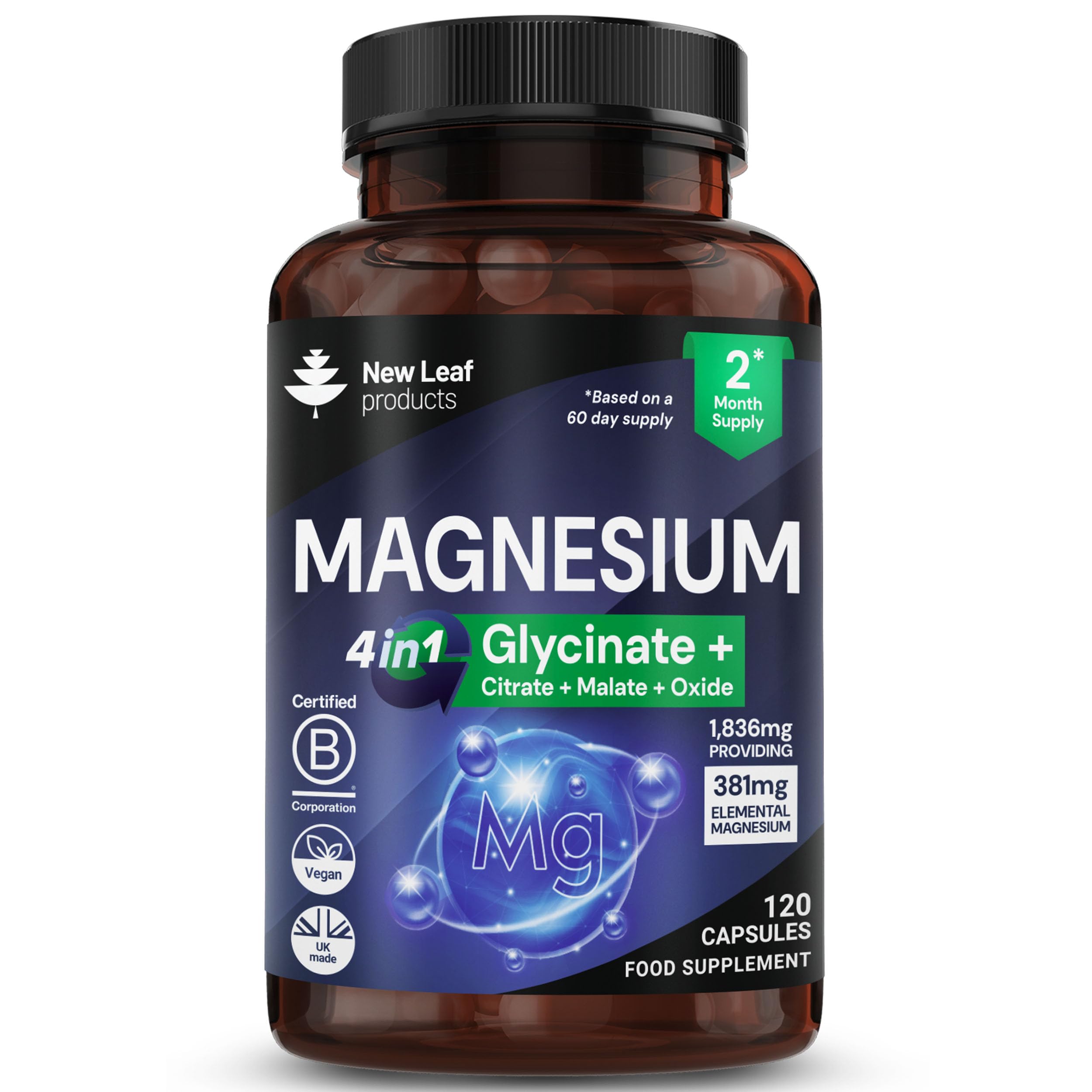 New Leaf's Magnesium Glycinate 4-in-1 Complex delivers a potent 1836mg dose of magnesium from four bioavailable forms, providing 381mg elemental magnesium per serving. Packaged as 120 vegan capsules, this UK-manufactured supplement supports muscle function, reduces fatigue, and promotes bone and nervous system health. Produced under rigorous quality controls, it’s a premium choice for professionals seeking comprehensive, clean, and effective magnesium supplementation.