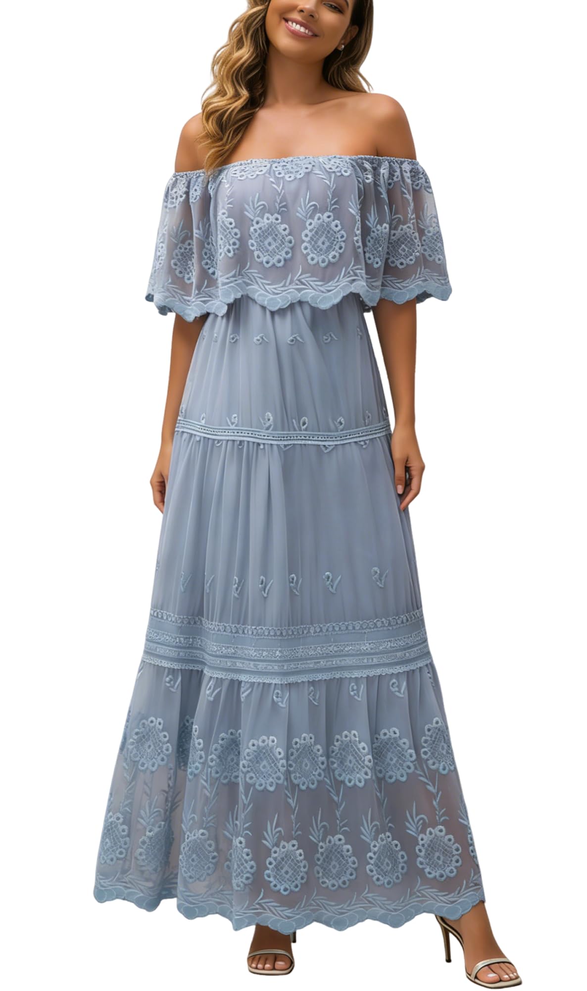 MERMAID'S CLOSET Women's Modern Classic is an off-shoulder maxi dress made from 100% breathable polyester with a high-quality embroidered lace overlay. Designed with an elastic neckline and waistband for a comfortable, flattering fit, it features crochet trimming and is fully lined except for the sleeves. Perfect for formal occasions like weddings, maternity photoshoots, and parties, this lightweight dress combines classic elegance with modern boho flair.