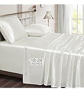 Vonty Satin Sheets King Size Set features ultra-soft 100% polyester satin with a glossy finish, designed for all-season comfort. The set includes a deep pocket fitted sheet (15 inches), a flat sheet, and two pillowcases in elegant ivory white. Durable and easy to care for, these sheets protect hair and skin while providing a luxurious sleep experience backed by thousands of positive reviews.