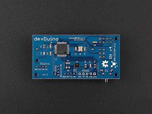 devDuino Sensor Node v4 is a compact Arduino-compatible microcontroller and is designed to build wireless networks based on transceiver nRF24L01+. You can easily connect other sensors or actuators to this platform, to build your remote monitoring or controlling system. Unlike the version 1,2,3 is on board built-in sensor temperature and humidity. Features: Built on Arduino-compatible architecture Clock frequency - 16MHz (may be reduced to reduce energy consumption by up to 8MHz) Integrated temperature & humidity sensor HTU21D (-40 ° C +125 ° C, accuracy of ± 2 ° C, relative Humidity: 0-100%, accuracy ± 2%) ISP programming interface (recommended) Serial programming interface Built-in clock button Built-in LED green (user configurable) 3 GROVE-compatible connector: I2C, Analog, Digital Power from one element CR123A (not included) Dimensions 30 x 65 mm Specification: Package Include: DevDuino Sensor Node V4 - 1 pcs. nRF24L01+ Module - 1 pcs.