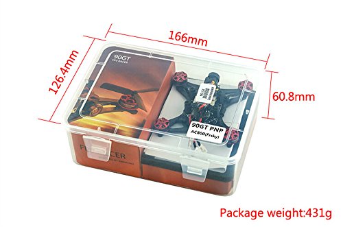 Features: - Micro F3 6DOF flight controller with 32-bit STM32F303CC processor and MPU6050 - Furious flying speed - 1103 7800KV brushless motors, high PRM - Powered by 350mAh 2S 7.4V 25C lithium-ion battery - 800TVL HD FPV camera, 150-degree FOV, 5.8G 16CH 25mW video transmitter - 90mm wheelbase, as big as your palm; only 42.9g, extremely light
