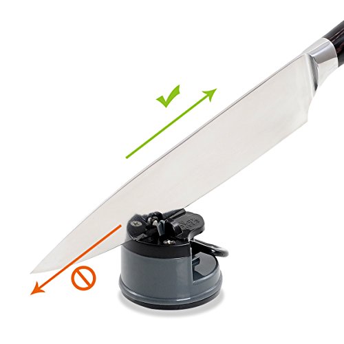 Product description: 1. Restore a super sharp cutting edge to blunt knives with this knife sharpener. 2. No special sharpening skills required; anyone can get great results. 3. Easy to use, simply draw your knife through the sharpener 3 to 4 times using light pressure. 4. The optimum angle to sharpen a good quality steel knife is 20 degrees. 5. Pre-set at 20 degrees to give a perfect edge every time. 6. Suitable for use with hardened knives, e.g. Global, Sabatier and with serrated knives such as bread knives and hunting knives. 7. Hands free suction grip base clamps on to surfaces. 8. Space saving design, small enough to be tucked away in a kitchen drawer. Featuring a silver color metal alloy body. Measures 2.36inch (6cm) diameter, 2.36inch (6cm) high. 9. Lifetime warranty. Note: Not suitable for use with ceramic knives or fine toothed knives. Package Contains: 1x Knife Sharpener