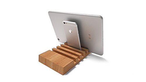 Keep your desk organized with this sleek and stylish 5 slot solid wood handmade charging station for multiple devices like smartphone, tablet or ebook reader. Fits a variety of gadgets including iPad, iPhone, Kindle and many more. Great for keeping all of the family devices in one place! Natural oak wood. Eco- friendly non-toxic pine oil finish. Slots lined with felt. Includes anti-slip microrubber pads on each corner to keep in place. 19 cm l x 12 cm w x 2.5 cm h, each slot 1.2 cm (7.48" l x 4.72" w x .98" h, each slot .47") Handmade in Poland.