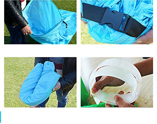 Enjoy it at the beach With our inflatable lounger, you will the envy at the beach, wait and see, everyone will want an inflatable lounger like yours Instruction: 1. After you filled the air, you should roll the four strips at least five laps, then it is most tight and not easy to leap. 2. It is more difficult to set-up without any wind, you should roll the four strips at least eight laps, but the length will be shorter. 3. Keep it away from hard and any sharp objects. 4. Be careful of glue, AVIOD with eyes, skin and clothes contact, otherwise with plenty of water to wash, away from children and fire. Ideal For: Beaches, Lakes, Pools, The Mountains, Hiking, Your Living Room & Anywhere else you want to relax in comfort Take all your family and enjoy the time outdoors. Our Inflatable sofa is a very good company for you. You can lay it down on the ground or grass as blanket and put all your staff on it. It can be your chair so that you don't have to sit down on the ground or grass. It can be your bed to enjoy a nap outside with nature. Enjoy it at the beach.