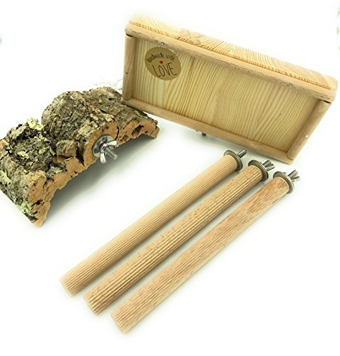 'Lovingly' All hand-made Starter Set consists of 3 ribbed Beech Wood perches (18 mm) with a length of 20 cm, a seat board "M" (20 cm x 10 cm) and a cork seat "M approx. 15 cm x 7.5 cm. Ideal for the home of a hutch or cage. The rails ensures a healthy support. The thickness of the wood, this makes these shaft Conures not completely umklammert is required. This Widerrum is designed to serve as the natural wear and tear of the claws. Can also be used for to maintain their beaks is the ribbing for best results. We have from the finest and highest quality raw materials. All our are made of stainless steel. You will receive 6 already mounted hanger bolts, 12 discs (6.4 x 25 mm), 6 wing nuts, all parts are made from stainless steel. This allows you to customize the simple, tool-free HDD installation anywhere on your pets cage. This set is the ideal starter or addition to the particularly tasteful home of your feathered friends. We use no zinc-plated parts, as zinc for birds Hochgiftig. Here are all metal parts made of stainless steel. The set has been lovingly handmade.