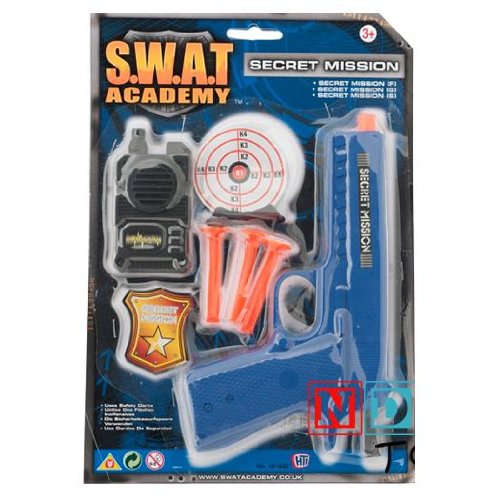 o on your own Secret Missions with this fun playset from the S.W.A.T collection. Set includes pull-back soft dart gun, card target, S.W.A.T badge and dress up walkie talkie. Minimum Age: 3+ Size of Product in cm: 31.5 x 22cm
