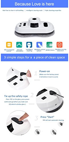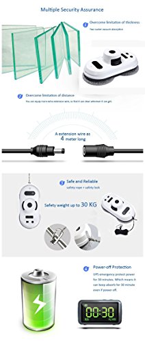 We usually ship it by DHL or Fedex about 3-7days,please be patience,thank you! Product size 298*150*120mm Product weight 945g Gift box size 300*234*140mm Gift box total weight 2.15kg Input Voltage 100~240VAC,50Hz/60Hz Adapter output 24v/3.75A Adapter certification UL,FCC,CE,RoHS Power consumption 80W AC power cord length 1.0m DC power cord length 4.0m Safety rope length 4.5m Battery 4xLi-Po,3.7V Battery working time 20 minutes Battery life time 2 years Cleaning speed 4min/meter^2 (clean twice everywhere) Maximum cleaning area Height:6 meters Wide:5meters LED Indicator lightstate LEDindicator light 1.Charging Orange 2.Fully charged Green 3.Cut off Red light flashing Warning sound 4.Hardware problems Red light flashing Blue lights flash error code 5.Check-the-friction-coefficient is too large or too small Red light flashes once Beep 6.Vacuum too low Red light flashes once Beep 7.Air leakage during operation Red light flashes once Beep please do not take risk to clean window with your life! Cleaning window glass by hand will need many tools and time.There is no easy way to clean window glass especially when you live in tall apartment building.Also will take big risk to clean external windows.If you hire someone to clean for you, will cause a high cost. Please message us if there is any question.
