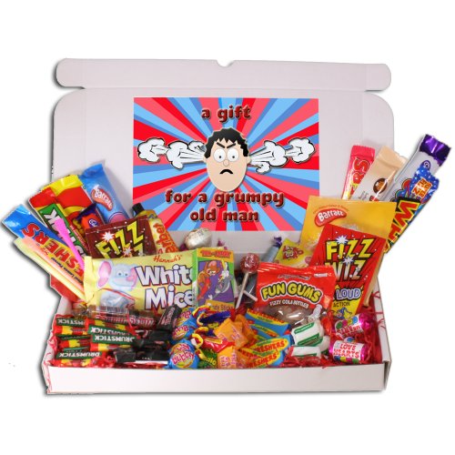 This is the perfect gift for the grumpy old man in your life. Full of retro sweets from years gone by, hopefully this will be enough to put a smile on his face. Complete with a ÔgrumpyÕ picture on the inside, this is a great and unusual gift for a birthday, or anniversary. As with all our products is sent out in a letterbox friendly box, so he wont have to grumble about missing the postman. This gift box contains:- 4 x Anglo Bubbly Bubble Gum, 1 x Bag of White Mice , 5 x Black Jack Chews, 1 x Box of Candysticks, 1 x Bubbaloo Cola, 1 x Bubbaloo Strawberry, 1 x Cadbury Fudge, 1 x Cadburys Freddo, 1 x Candy Necklace (or Candy Watch), 1 x Candy Whistle, 1 x Caramac, 1 x Cola Fizz Wiz Popping Candy, 1 x Curly Wurly, 1 x Double Lolly, 1 x Drumstick Chewbar, 4 x Drumstick Lolly, 2 x Fizzers, 1 x Fizzy Cola Bottle Mini Fun Gums, 1 x Flump, 5 x Fruit Salad Chews, 1 x Highland Toffee Chew Bar, 3 x Mini Loveheart Roll, 3 x Mini Rainbow Dust Straws , 2 x Parma Violets, 1 x Refresher Chew Bars, 6 x Refresher Original Chews, 1 x Sherbet Dipdab, 1 x Sherbet Fountain, 4 x Spearmint Chews, 1 x Strawberry Fizz Wiz Popping Candy, 1 x Strawberry Refresher Chew Bar, 2 x Traffic Light Lolly, 1 x Wham Chew Bar, 1 x Wine Gummies, Very occasionally some items will be substituted, if for example we cannot get hold of an item, but this is rare.