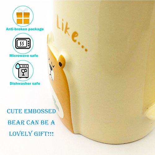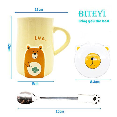 FEATURES:1.SIZE:Mug:8cm x 8cm x 12cm(3.15 x 3.15 x 4.7inches) Spoon:15cm(5.9inches) 2.MATERIAL:Mug:Ceramic Spoon:Silicone and stainless steel3.CAPACITY:460ml4.WEIGHT:415 g5.PATTERN:Embossed BearPERFECT CUPS AND GIFTS:Good for coffee,milk,tea,and hot chocolate,available for everyday use.Perfect presents for mom,friends,girlfriend,sister,wife,children,animal lovers or someone else in any special occasion.NOTE FOR USE:1.Dishwasher and microwave safe,handwash recommended.2.Do not scrub with steel balls,with a mild detergent and a soft cloth or sponge to clean.3.Wash and dry after water vapor,keep dry,to prevent the growth of bacteria.PACKAGE INCLUDE:1 x mug1 x spoon(The handle of the spoon can be disassembled) 1 x Lid