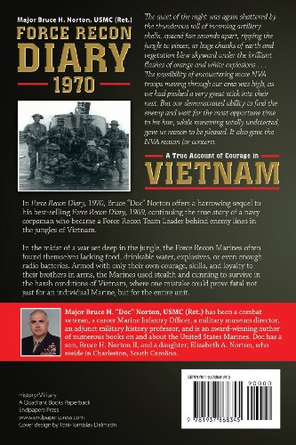 The quiet of the night was again shattered by the thunderous roll of incoming artillery shells, spaced five seconds apart, ripping the jungle to pieces, as huge chunks of earth and vegetation blew skyward under the brilliant flashes of orange and white explosions . . . The possibility of encountering more NVA troops moving through our area was high, as we had pushed a very great stick into their nest. But our demonstrated ability to find the enemy and wait for the most opportune time to hit him, while remaining totally undetected, gave us reason to be pleased. It also gave the NVA reason for concern. In "Force Recon Diary, 1970," Bruce "Doc" Norton offers a harrowing sequel to his best-selling "Force Recon Diary, 1969," continuing the true story of a navy corpsman who became a Force Recon Team Leader behind enemy lines in the jungles of Vietnam. In the midst of a war set deep in the jungle, the Force Recon Marines often found themselves lacking food, drinkable water, explosives, or even enough radio batteries. Armed with only their own courage, skills, and loyalty to their brothers in arms, the Marines used stealth and cunning to survive in the harsh conditions of Vietnam, where one mistake could prove fatal not just for an individual Marine, but for the entire unit.