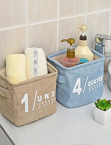 COLOURBrownGreyPinkBlueSPECIFICATION20(Length) x 16(Width) x 15(Height) Cm7.9(Length) x 6.3(Width) x 5.9(Height) InchesMATERIALThis storage bag is made of 100% Natural Linen and Cotton Fabric + EVA Inner + Burlap LiningLinen is laborious to manufacture, but the fiber is very absorbent.The surface of linen cloth has a good texture and a slight nap,which makes it aesthetic but also durable.Cotton Fabric has a good hygroscopicity and breathability, comfortable to wear, soft to touch,and it is anti-insect.The EVA inner and burlap lining makes this organizer bag more tough,not easy to tore up.USAGEIt can be put on the table as storage box for household gadgets , sundries,phone charger,USB cable,remote control,playing cards.It can be put in study room as storage box for books,pens,stationery,envelopes,file folder.It can be put in bathroom as storage box for toothpaste,toothbrush,towels,shampooIt can be put in living room as storage box for socks,underwear,bras,comestic,makeup, manicure items.It can be put in children room as storage box for toys,hairpin,tablet,baby items.This organizer bag can keep your room tidy and neat,and also it can make your room more beautiful.DESIGNThis storage bag has two handles,it is convenient to be carried,easy to move.It can hold heavy items,with this two handles,you no longer have to worry about handling your items.This organizer bags also looks stylish and cute,if you are looking for a decoration for your room,it can be a good choice.You can use it both for decoration and storage.If your baby are learning numbers,it is also a good gift for your child.Cause it is lovely and it has printed number in the front.Your kids will love themINCLUDED4 x storage baskets