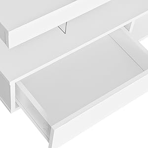 The ModernLuxe Coffee Table combines elegant high gloss white surfaces with practical storage—two drawers plus two open compartments—while integrating smart 16-color LED lighting controllable via Bluetooth. USB powered for easy connectivity, this stylish side table is designed for modern living rooms seeking both function and flair, with quick assembly to match.