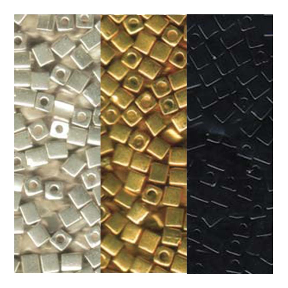 This Metallic Miyuki 4mm Square Bead Bundle includes 60 grams of high-quality Japanese glass seed beads in metallic gold, silver, and opaque black, perfect for enhancing your jewelry and craft projects.