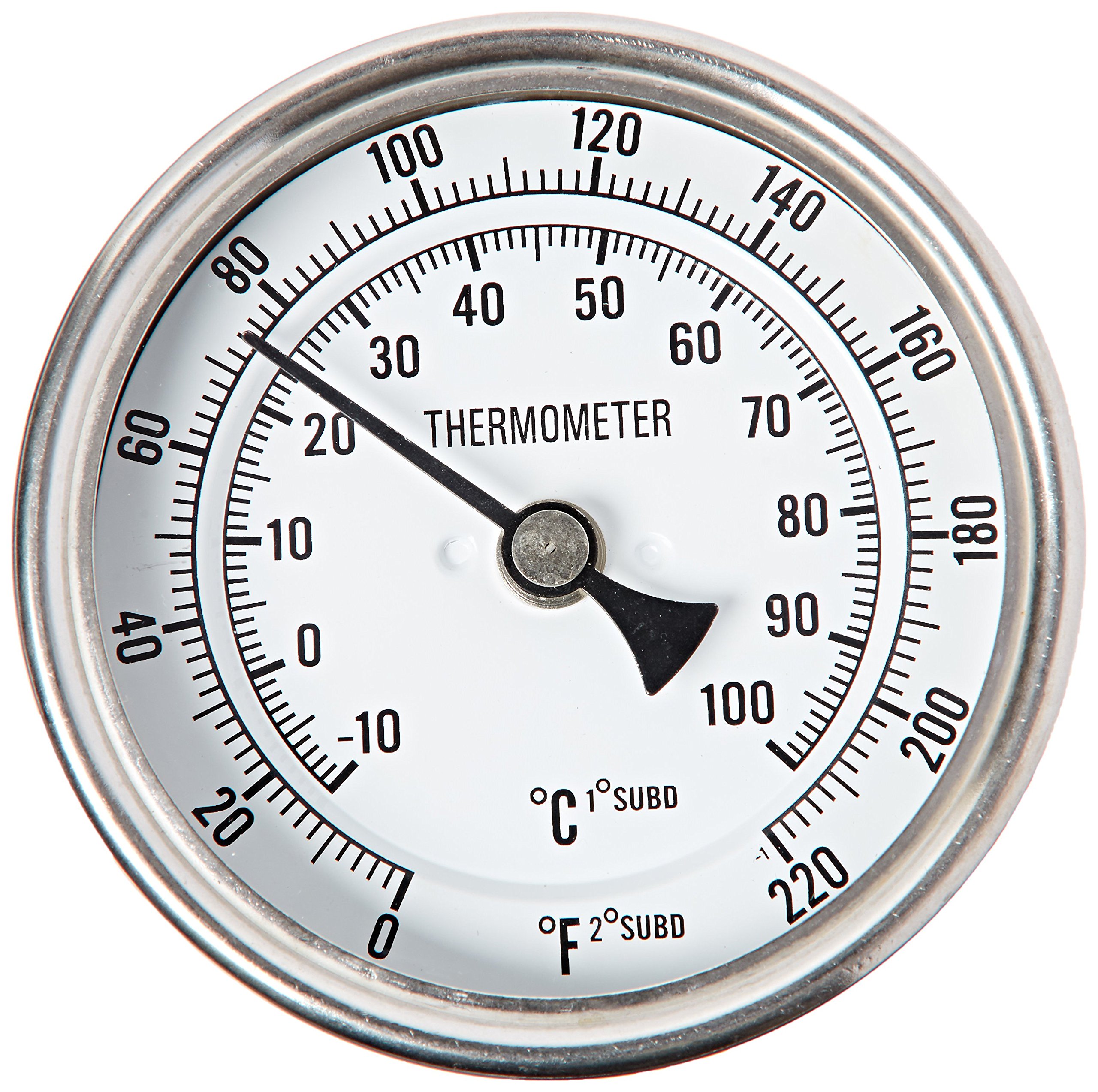 3" dial glass face thermometer for installation into a brew kettle, or anywhere that you need constant accurate temperature monitoring. Range: 0- 220 degree, size: 3", face 2.5". The probe weldness kits includes: (1) 304S/S locknut, (2) 304S/S flat washer, (3) silicone O-ring seals, (4) thermometer.