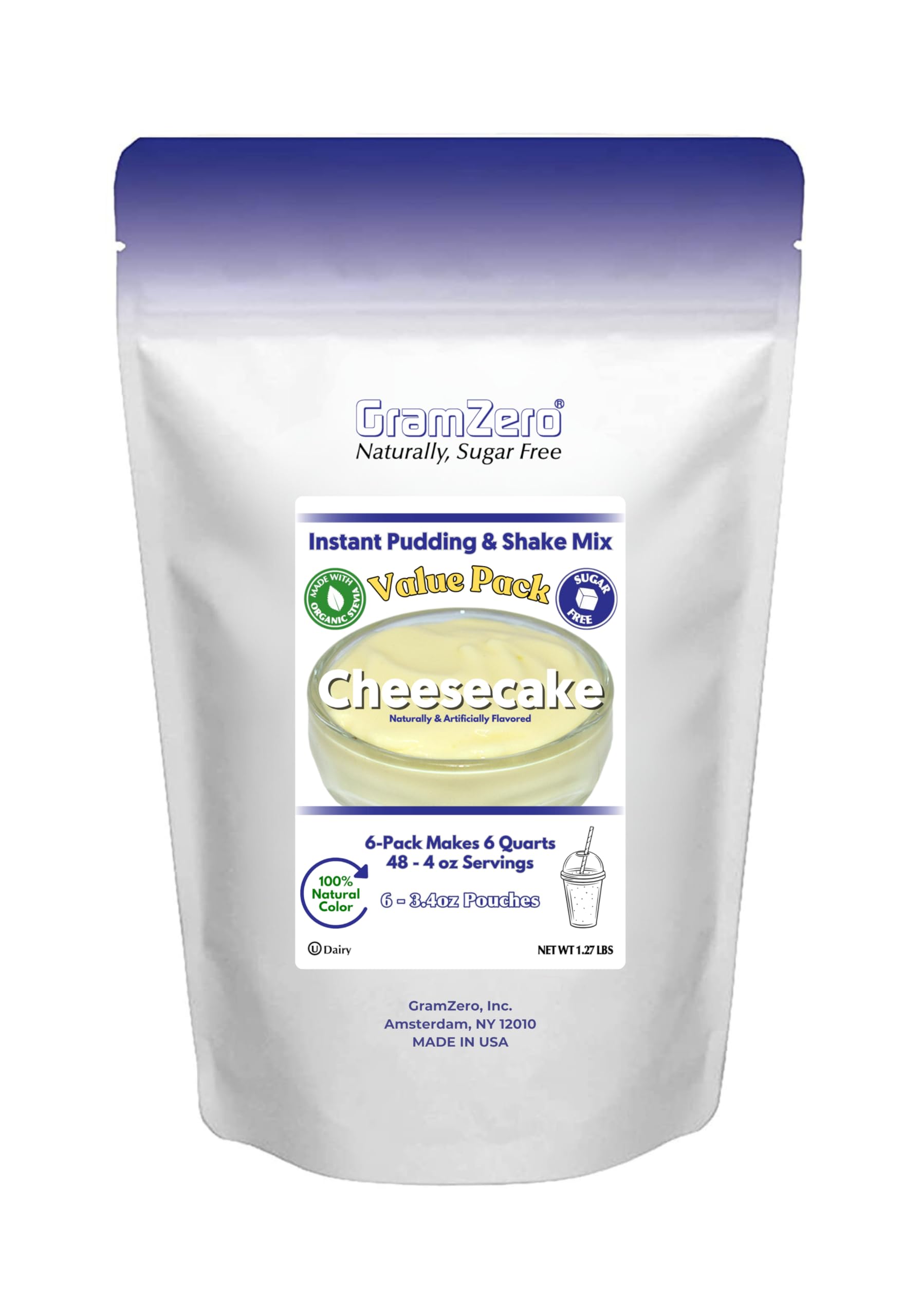 GramZero Cheesecake Sugar Free Pudding Mix is a low-carb, keto-friendly dessert sweetened exclusively with organic stevia. Each 3.4 oz pouch makes 32 oz of creamy pudding with no artificial sweeteners or sugar alcohols. Perfect for quick, nutritious desserts or enhancing meal replacement shakes, this kosher, non-GMO pudding mix delivers 48 servings per 6-pack, supporting healthy lifestyles with clean, family-crafted ingredients.
