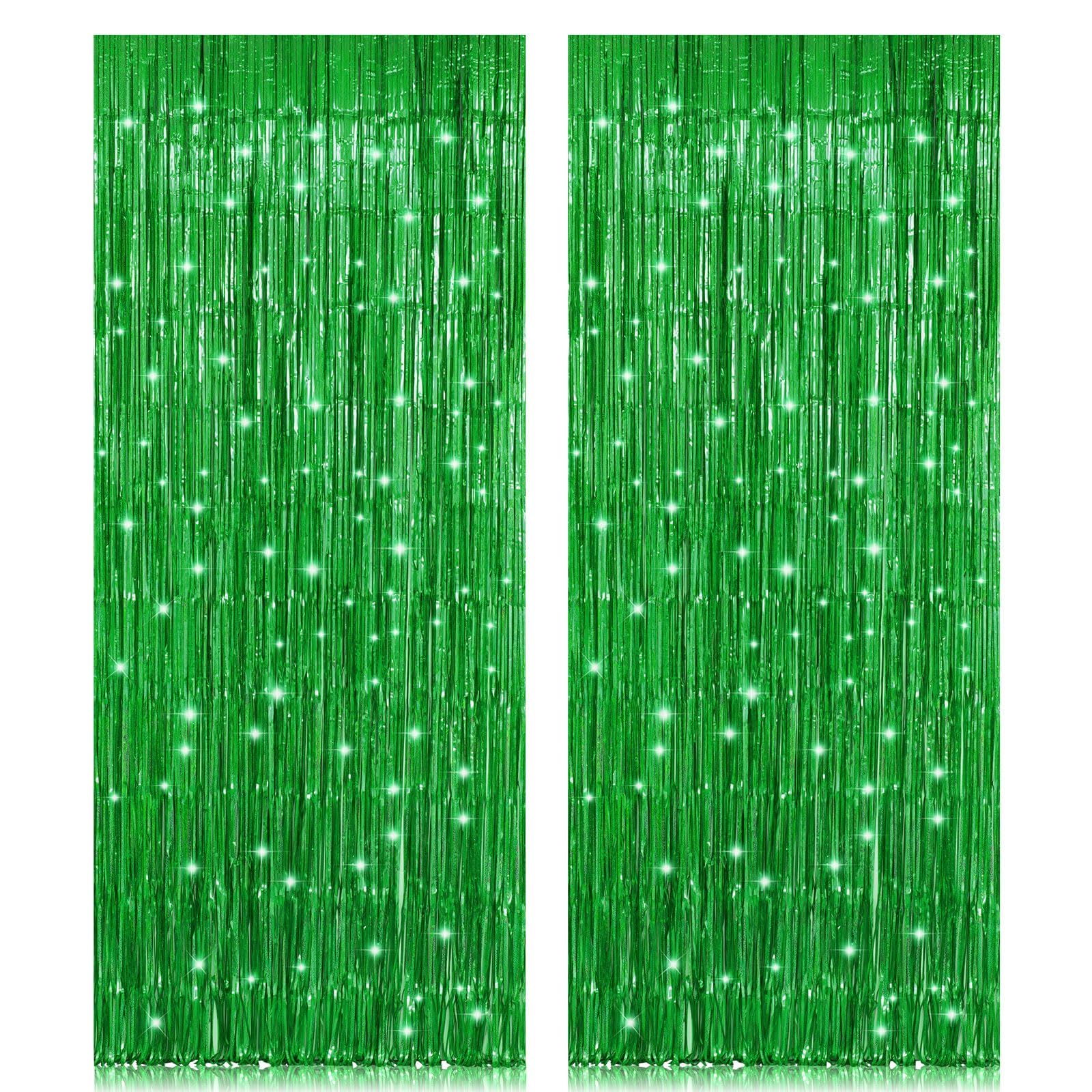 This 2-pack set of green metallic foil fringe curtains measures 3.2ft by 8.2ft each, made from high-quality 23μm PET film with laser spangle for superior shine and durability. Designed for easy installation with double-sided adhesive tape, these curtains are cuttable and versatile, perfect for creating eye-catching backdrops at parties, photo booths, and festive events. Lightweight and non-toxic, they add a vibrant, customizable touch to any celebration.
