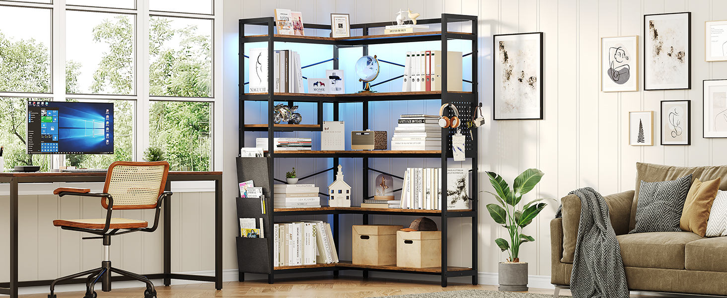 We bought this bookshelf for storage in our apartment laundry room. The L-shaped configuration fit perfectly in the space we have and added a ton of storage. It is very sturdy and went together well. It has more features than we need for our space, but we will just store the side envelopes and the lights in case we ever decide to move it into another space.