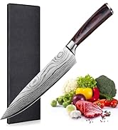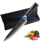 The Trovexx Damascus Chef's Knife features an 8-inch ultra-sharp German high carbon stainless steel blade with a precise 2mm thickness, hand-polished for lasting sharpness. Its ergonomic pakkawood handle ensures superior balance and comfort, making it ideal for professional chefs and home cooks alike. This versatile knife excels at chopping, slicing, and dicing a variety of foods, while the included sheath enhances safety and blade protection.